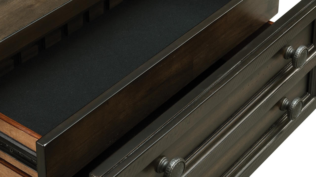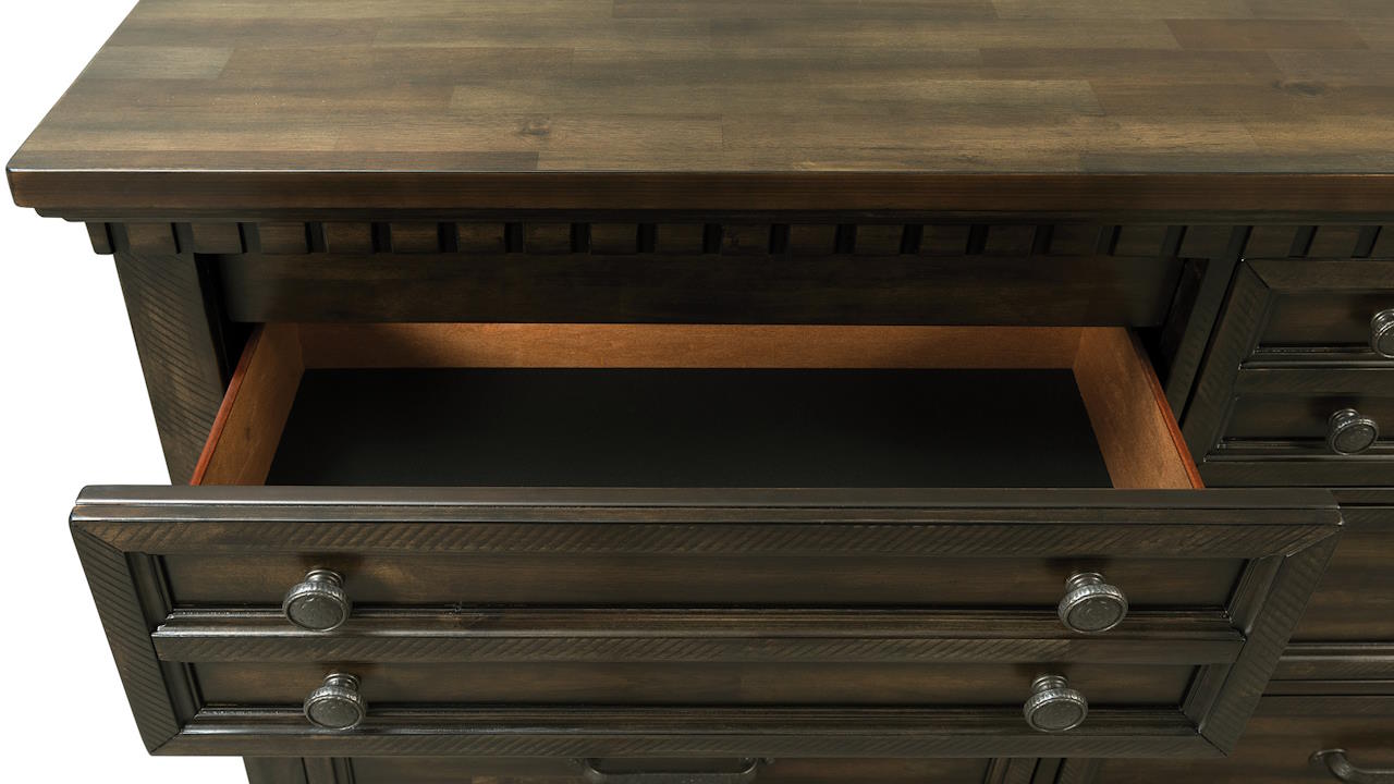 Bring a look of sophistication while adding functionality into your bedroom with the McCoy Bedroom Set by Elements International Furniture. The McCoy Collection is beautifully crafted with a dark brown distressed finish and offers tons of features. The McCabe Bedroom has traditional design details such as dentil molding, square tapered feet, and raised drawer panels. These modern features include a king size panel style storage bed, a dresser with an attached mirror, and a 2 drawer nightstand with two convenient USB ports. Additionally, the dresser and nightstand offer felt lined top drawers and hidden drawers for storing jewelry and other personal items. The McCoy Bedroom Set is gorgeous and wonderfully functional. Price includes king size bed, dresser with mirror and one nightstand.