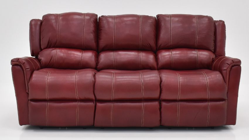 Discover your comfort zone with the relaxed style of the Mercury POWER Reclining Leather Sofa by HomeStretch. The American-made Mercury POWER Reclining Sofa, with dual recliners, does an excellent job of blending ultimate cushioning with casual design. Power features include power reclining with the touch of a button. Additional features include plush pillow arms, a form-fitting scoop-style seat with a tufted seat back, and contrast stitching in a merlot red top-grain leather upholstery. The Mercury Power Reclining Sofa offers you so much - with the touch of a button you can sit back, relax, and recline on the no-gap chaise and unwind after a long day.