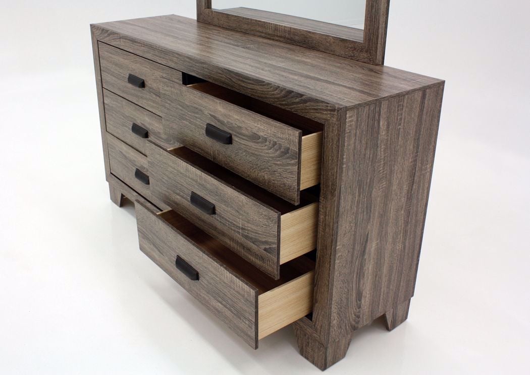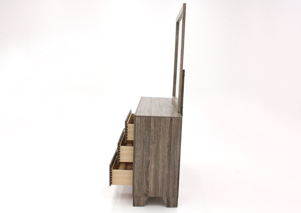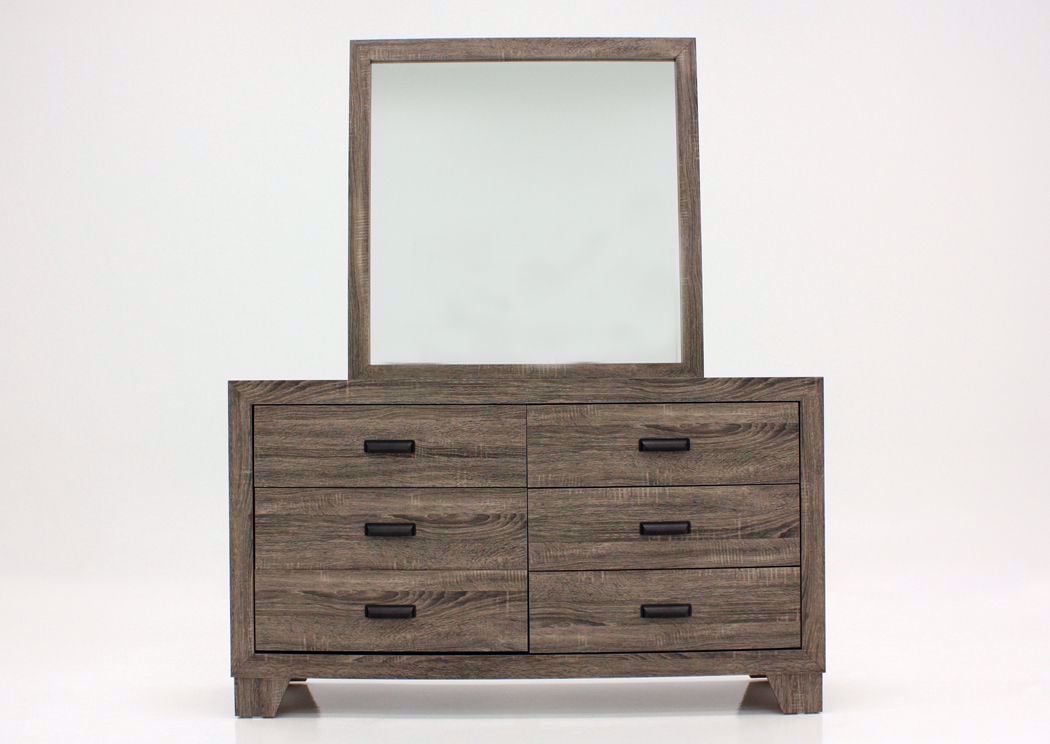 The Millie Dresser with Mirror reflects the transitional style of the Millie Collection – Stylish, clean lines with a soft gray finish. The Millie dresser has an attached framed mirror and 6 drawers. The soft wood grain finish is accented by metal drawer pulls that bring a touch of industrial design to your room. The Millie Dresser with Mirror can easily coordinate with most design styles and bring a fresh new look to your room while offering a great storage optionKey Features