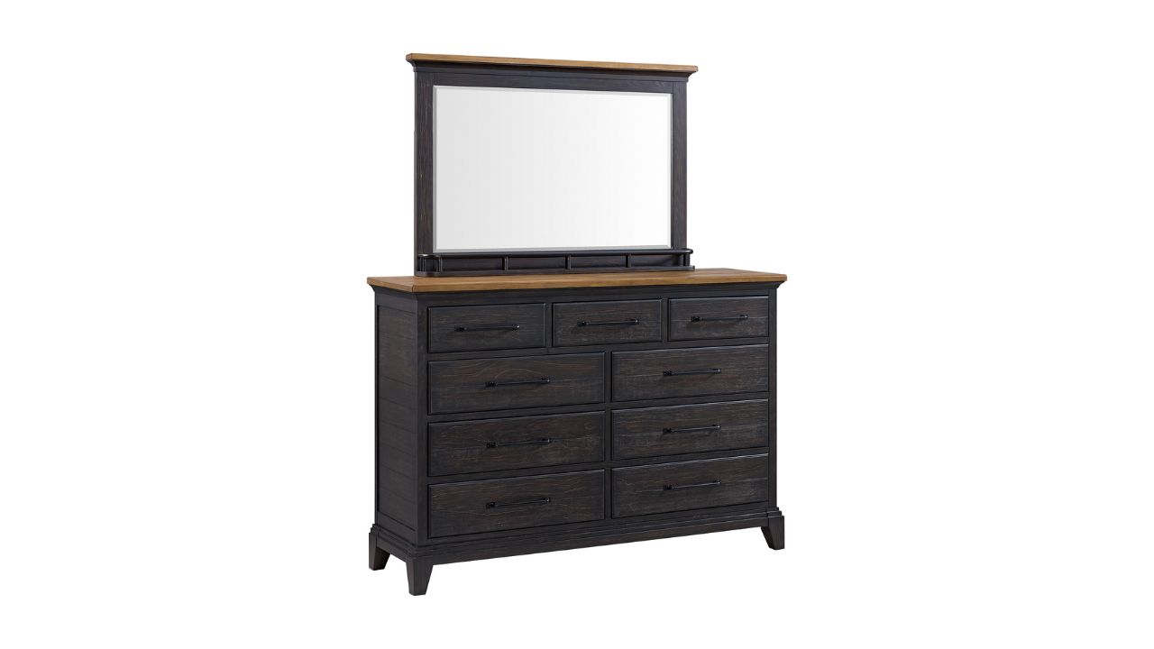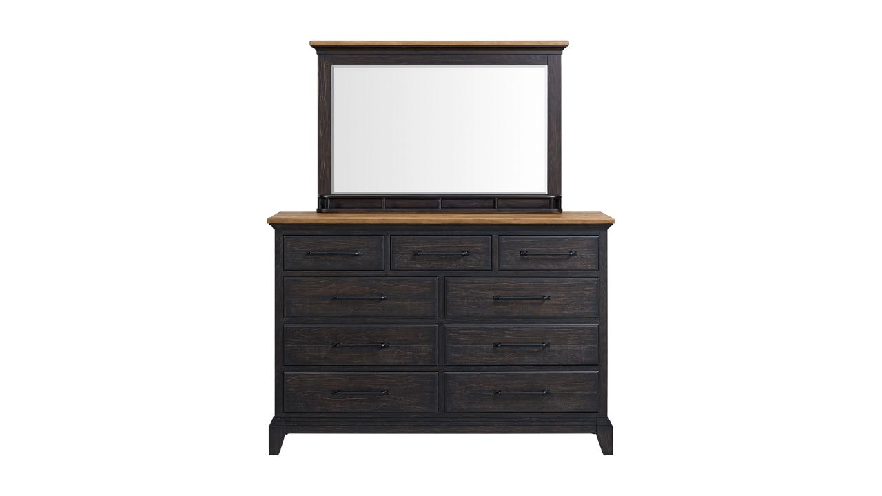The Montrose Dresser and Mirror Set brings a relaxed sense of refinement to your bedroom. A rich espresso and brown dual-tone finish, transitional lines create a timeless look, while smart storage details add everyday ease. Thoughtfully crafted and beautifully balanced, this set blends elegance with practical organization.