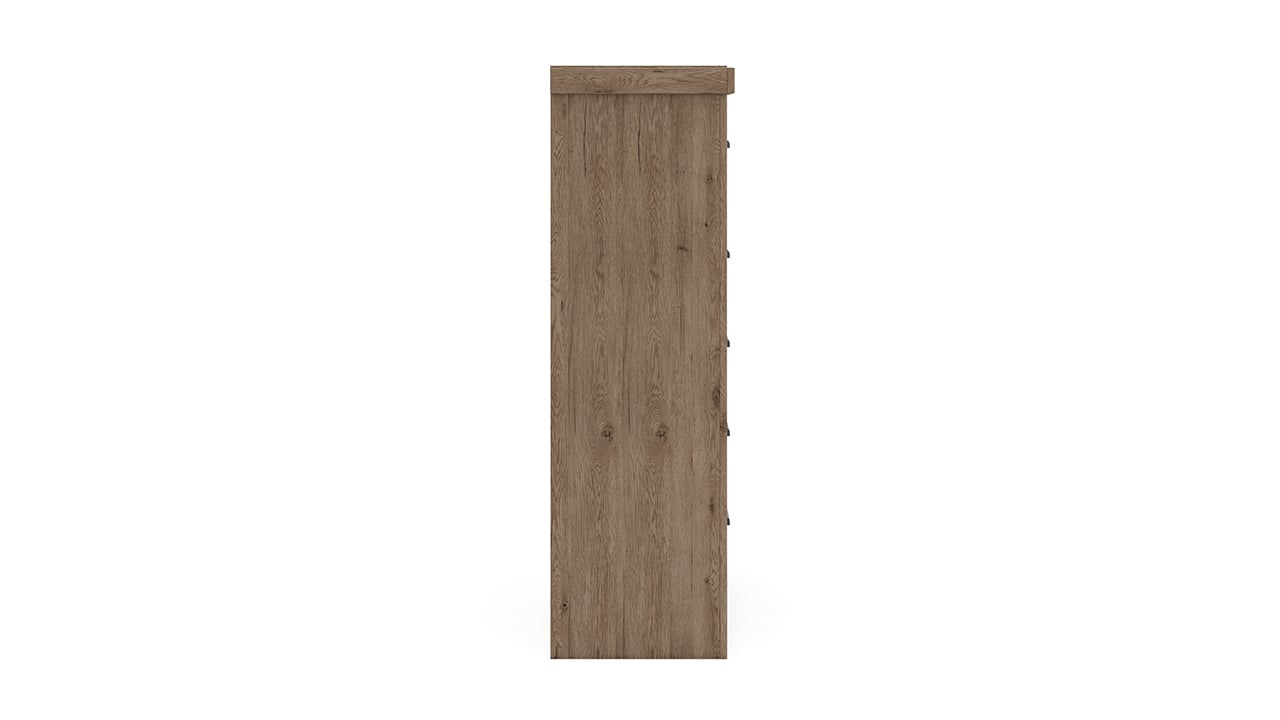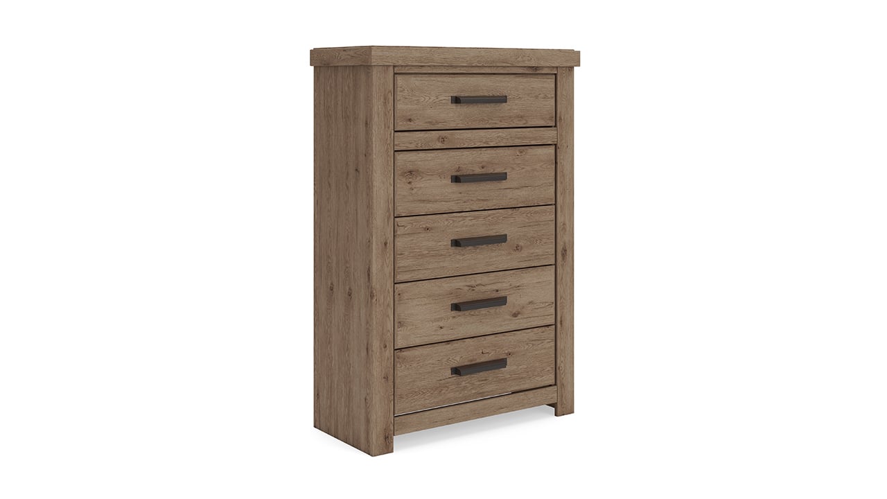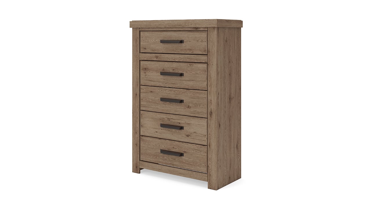 The Oliandon Queen Bedroom Set in a natural rustic finish brings a cohesive, trend-right look to the bedroom with warm oak-inspired tones and clean, dimensional styling. Featuring the queen panel bed, matching dresser with mirror, and nightstand, it blends rustic character with modern simplicity for a timeless, well-balanced space.