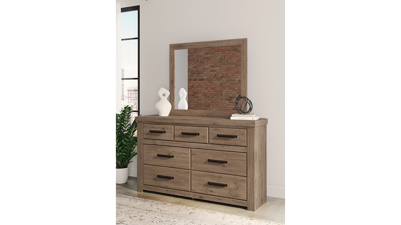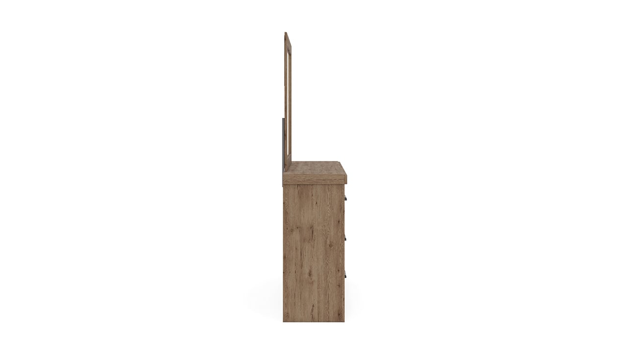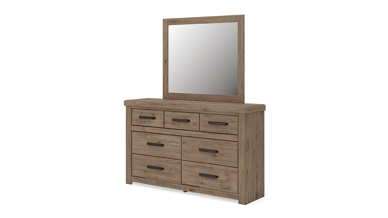 The Oliandon Queen Bedroom Set in a natural rustic finish brings a cohesive, trend-right look to the bedroom with warm oak-inspired tones and clean, dimensional styling. Featuring the queen panel bed, matching dresser with mirror, and nightstand, it blends rustic character with modern simplicity for a timeless, well-balanced space.
