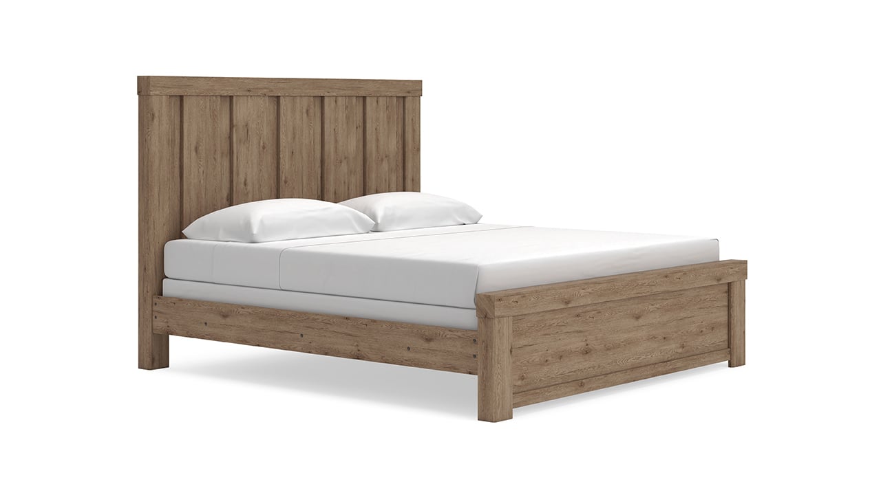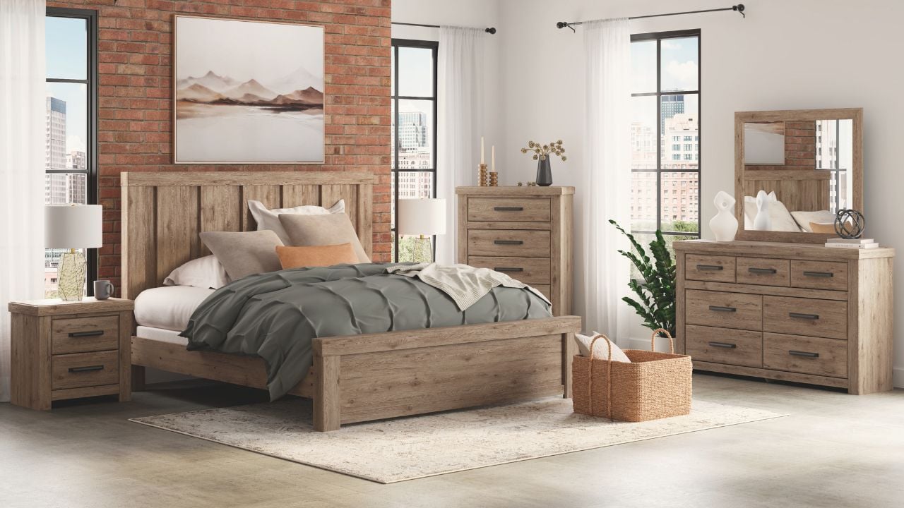 The Oliandon Queen Bedroom Set in a natural rustic finish brings a cohesive, trend-right look to the bedroom with warm oak-inspired tones and clean, dimensional styling. Featuring the queen panel bed, matching dresser with mirror, and nightstand, it blends rustic character with modern simplicity for a timeless, well-balanced space.