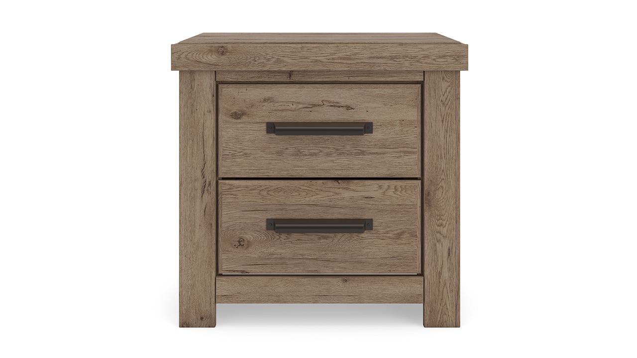 The Oliandon Nightstand in a natural rustic finish brings a fresh, trend-right spin on rustic design. With warm oak-inspired tones, clean minimalist lines, and dimensional detailing, it blends effortless style with everyday function. A thick, substantial top and integrated USB charging make it as practical as it is timeless.