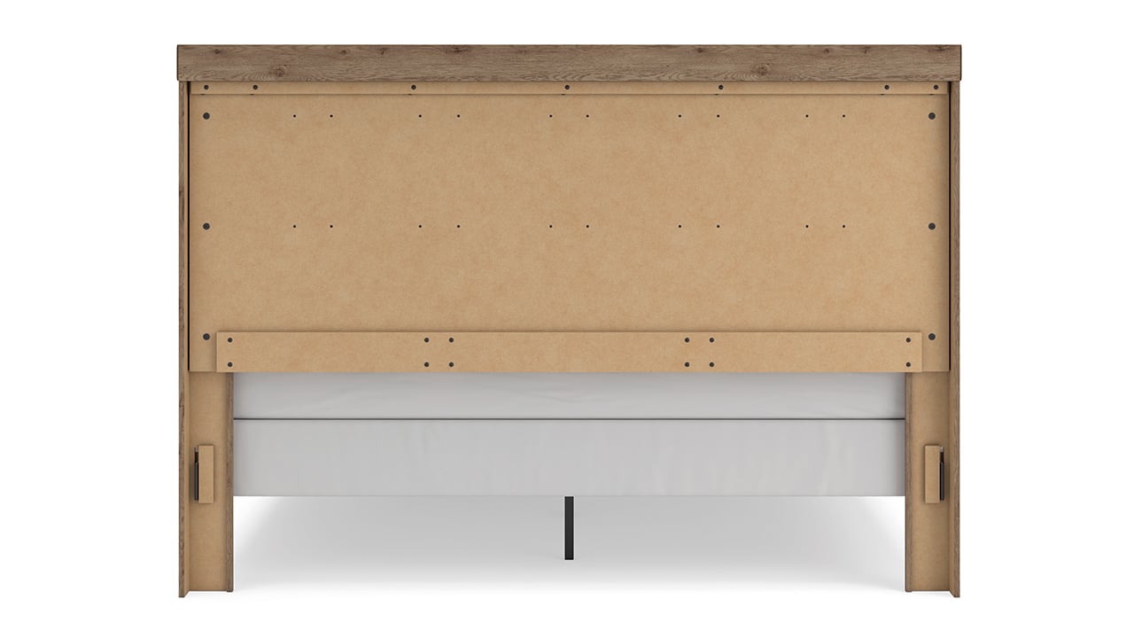 The Oliandon Queen Panel Bed in a natural rustic finish brings a fresh, trend-right take on classic rustic style. With warm wood tones, log-look accents, and dimensional oak-inspired detailing, it creates a grounded yet effortlessly chic presence that adds timeless character to any bedroom.