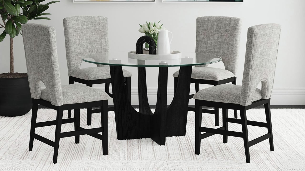 Refine your dining space with the effortless elegance of the Oregon 5-Piece Glass Top Dining Set. A sleek glass tabletop brings a light, open feel, beautifully balanced by the sculptural wood base beneath. Paired with four upholstered chairs in a soft neutral fabric, this set creates a look that’s both modern and inviting—perfect for everything from everyday meals to relaxed gatherings.