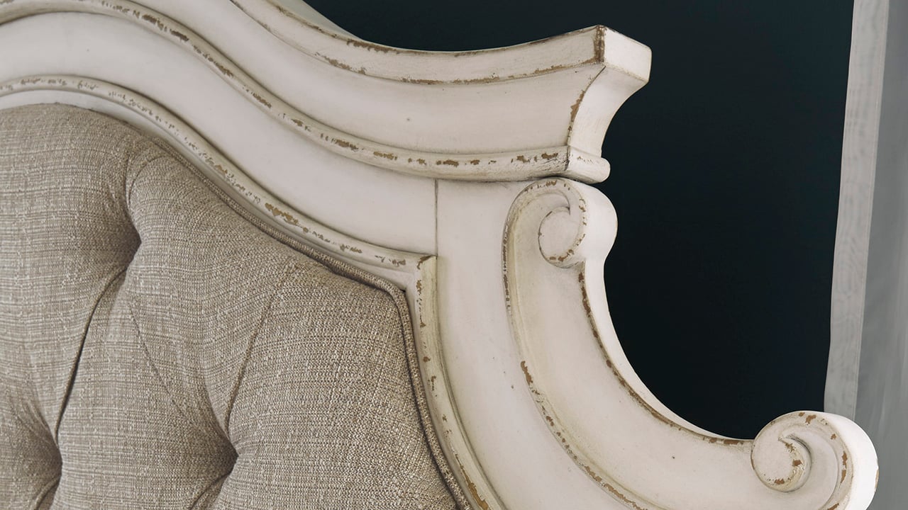 Realyn Full Size Bedroom Set by Ashley Furniture. Upholstered Headboard with Button Tufted Accents. Antique White. Includes Bed, Dresser with Mirror, Nightstand.
