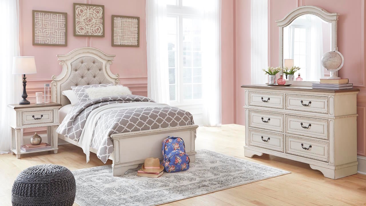 Realyn Full Size Bedroom Set by Ashley Furniture. Upholstered Headboard with Button Tufted Accents. Antique White. Includes Bed, Dresser with Mirror, Nightstand.
