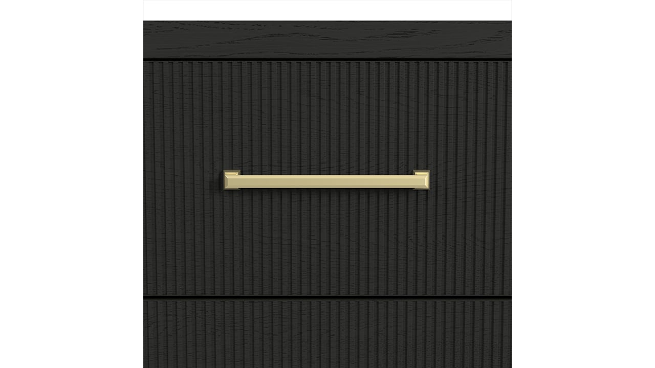 Create a calm, modern retreat with the Ridgemont Twin Bedroom Set. A rich black finish with subtle wood grain detailing sets a sophisticated tone, while softly rounded edges and vertical reeding add depth and dimension. Warm gold bar pulls introduce a refined contrast, blending modern elegance with everyday functionality.