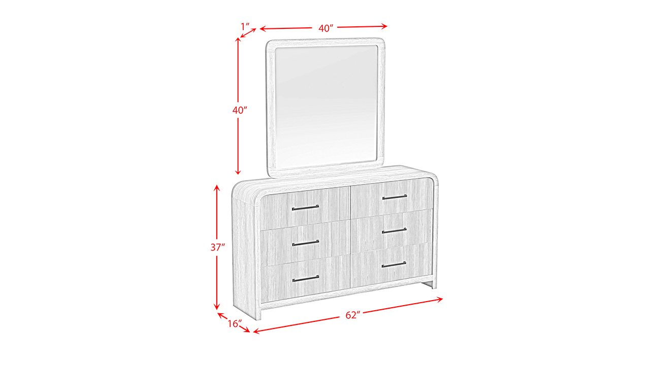 The Ridgemont Dresser & Mirror Set features a light wood finish, sleek rounded edges, vertical reeding, and spacious drawers with bold black pulls for a modern, elegant look.