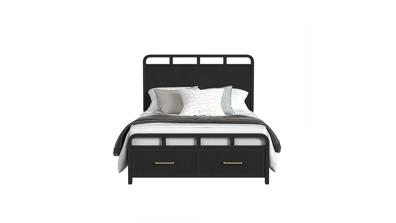 Create a calm, modern retreat with the Ridgemont Twin Bedroom Set. A rich black finish with subtle wood grain detailing sets a sophisticated tone, while softly rounded edges and vertical reeding add depth and dimension. Warm gold bar pulls introduce a refined contrast, blending modern elegance with everyday functionality.