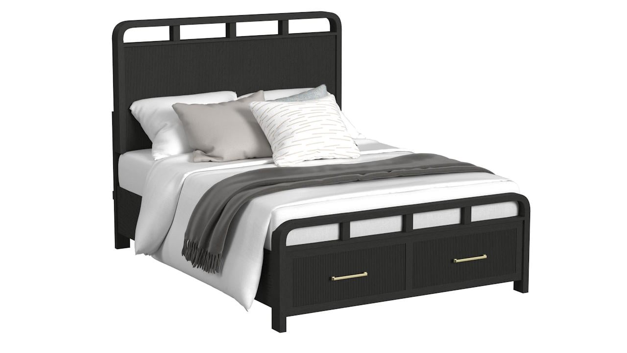 Anchor your space with the modern sophistication of the Ridgemont Full Bedroom Set. The bold black finish is balanced by subtle wood grain detailing and warm gold bar pulls, creating an inviting yet polished look. Clean lines, soft curves, and thoughtful storage bring effortless style to your bedroom.