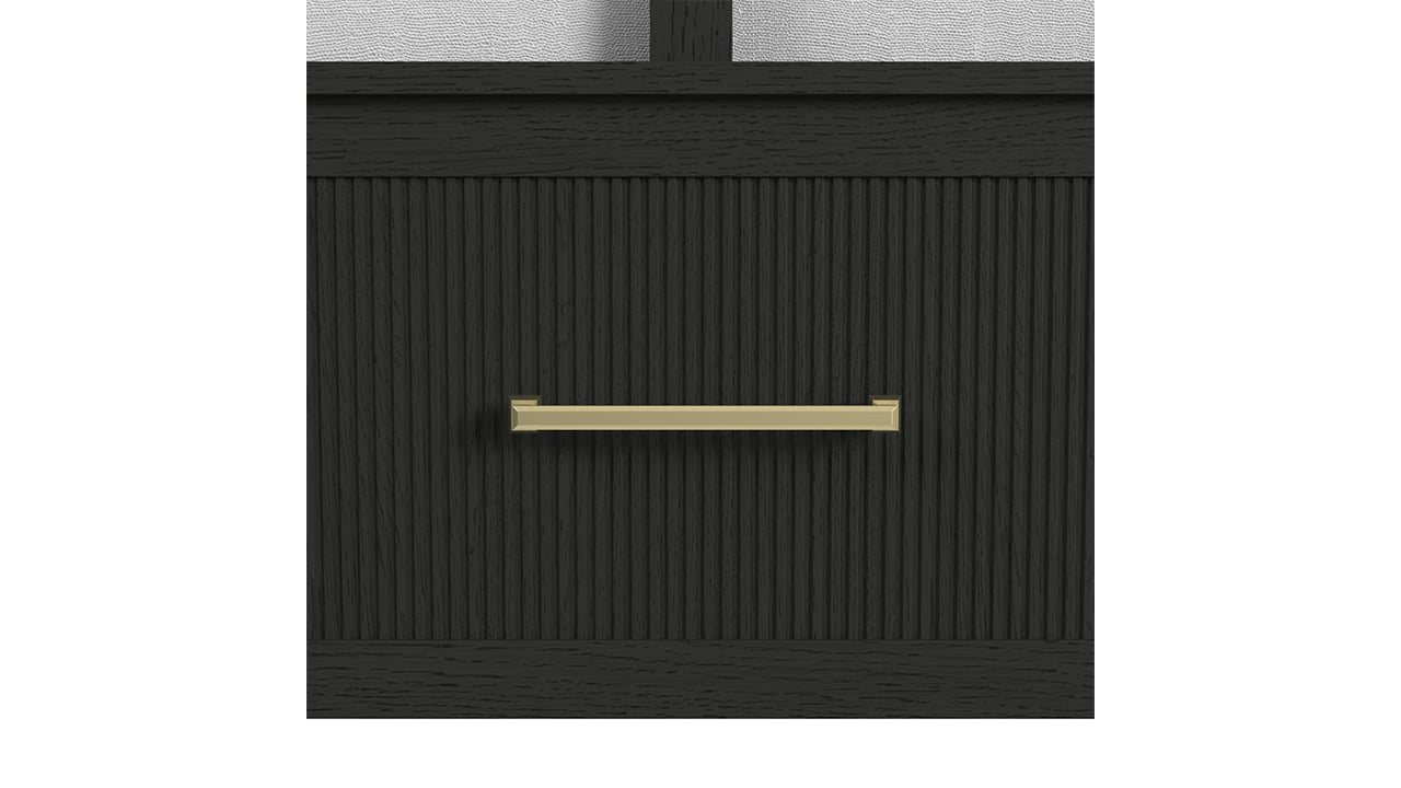 Create a calm, modern retreat with the Ridgemont Twin Bedroom Set. A rich black finish with subtle wood grain detailing sets a sophisticated tone, while softly rounded edges and vertical reeding add depth and dimension. Warm gold bar pulls introduce a refined contrast, blending modern elegance with everyday functionality.