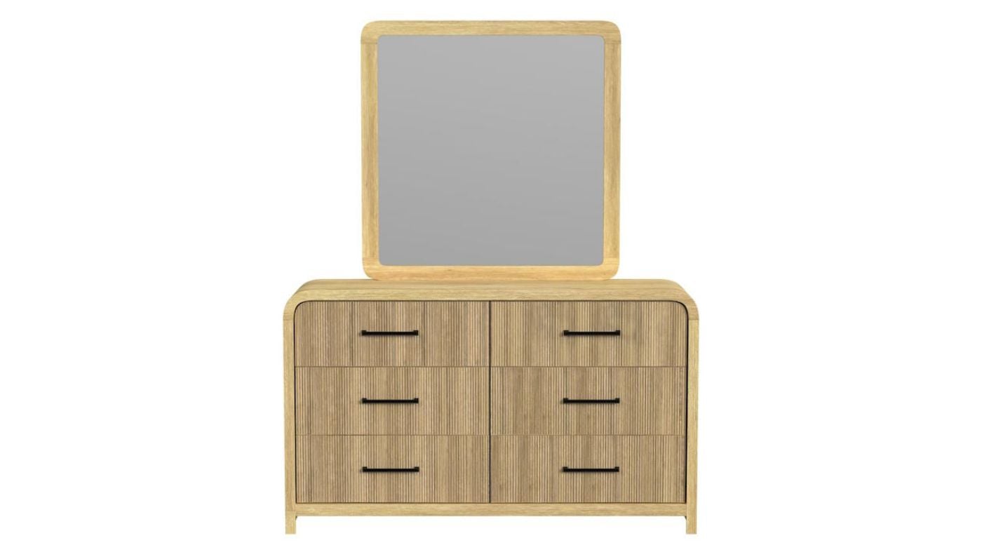 Ridgemont Dresser & Mirror Set:The Ridgemont Dresser and Mirror Set brings modern charm and elegance to your bedroom. The dresser, crafted with a natural wood finish and vertical reeding, offers both style and function. The sleek, rounded edges create a soft, refined look, while the spacious drawers with bold black bar pulls provide ample storage space. The black felt-lined top drawer ensures delicate items are kept safe, and the mirror perfectly complements the dresser, enhancing the room’s visual appeal. This dresser is a statement piece that adds warmth and sophistication to any space.