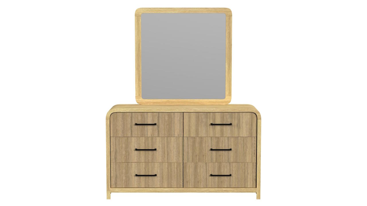 The Ridgemont Dresser & Mirror Set features a light wood finish, sleek rounded edges, vertical reeding, and spacious drawers with bold black pulls for a modern, elegant look.