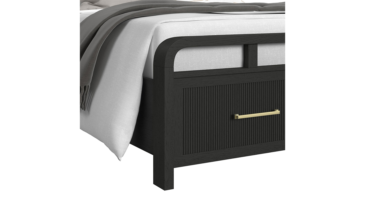 Create a calm, modern retreat with the Ridgemont Twin Bedroom Set. A rich black finish with subtle wood grain detailing sets a sophisticated tone, while softly rounded edges and vertical reeding add depth and dimension. Warm gold bar pulls introduce a refined contrast, blending modern elegance with everyday functionality.