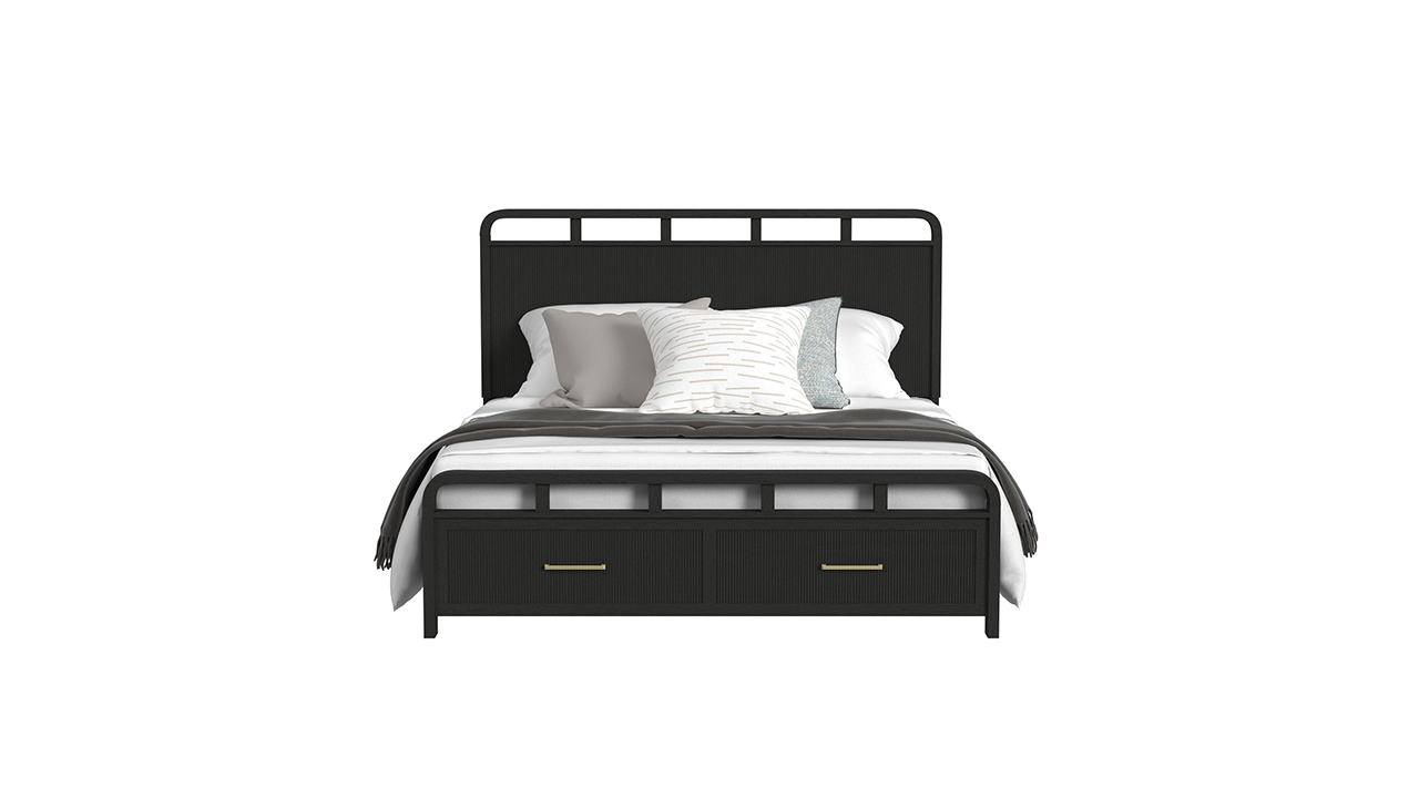 Anchor your space with the modern sophistication of the Ridgemont Full Bedroom Set. The bold black finish is balanced by subtle wood grain detailing and warm gold bar pulls, creating an inviting yet polished look. Clean lines, soft curves, and thoughtful storage bring effortless style to your bedroom.