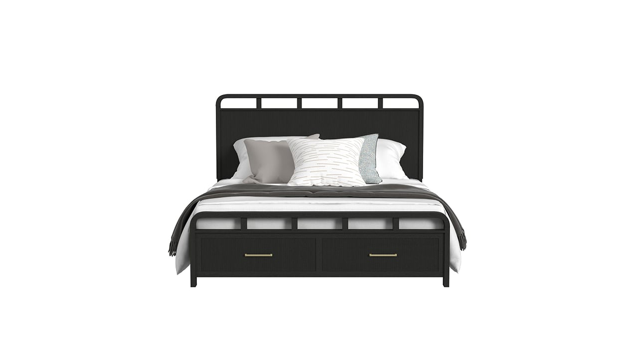 Make a bold yet calming statement with the Ridgemont King Bedroom Set. Finished in a rich black tone with subtle wood grain detailing, this collection is elevated by warm gold bar pulls and refined textures. Clean lines, ample storage, and modern conveniences create a beautifully balanced bedroom retreat.