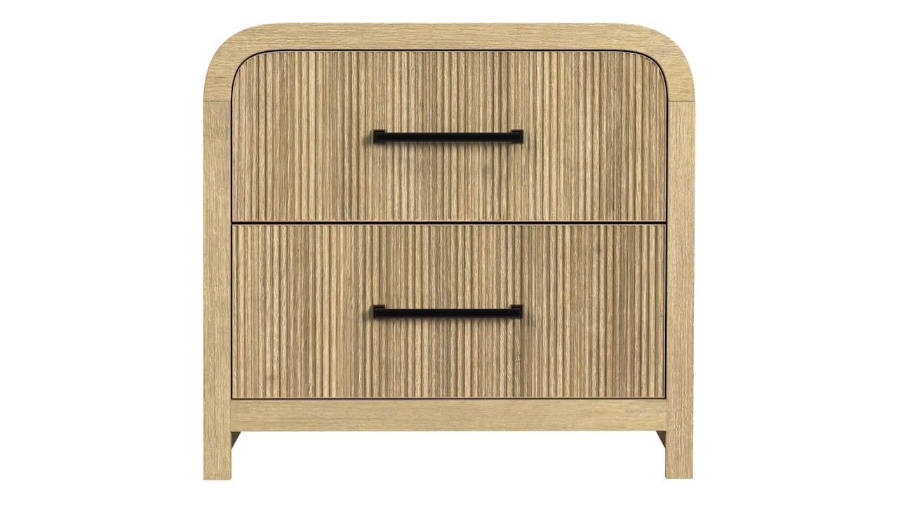 The Ridgemont Nightstand in Natural features a sleek light wood finish with vertical reeding, a USB port, a black felt-lined top drawer, and spacious drawers with bold black bar pulls, combining modern design with functional storage.