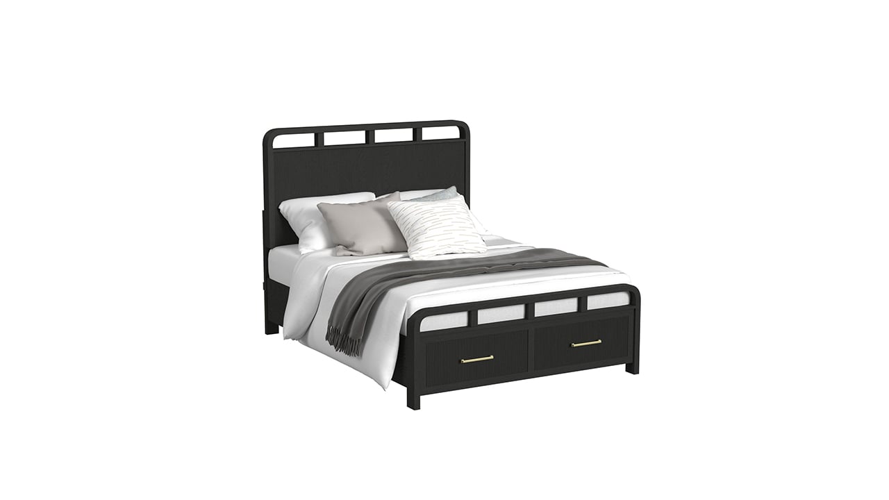 Anchor your space with the modern sophistication of the Ridgemont Full Bedroom Set. The bold black finish is balanced by subtle wood grain detailing and warm gold bar pulls, creating an inviting yet polished look. Clean lines, soft curves, and thoughtful storage bring effortless style to your bedroom.