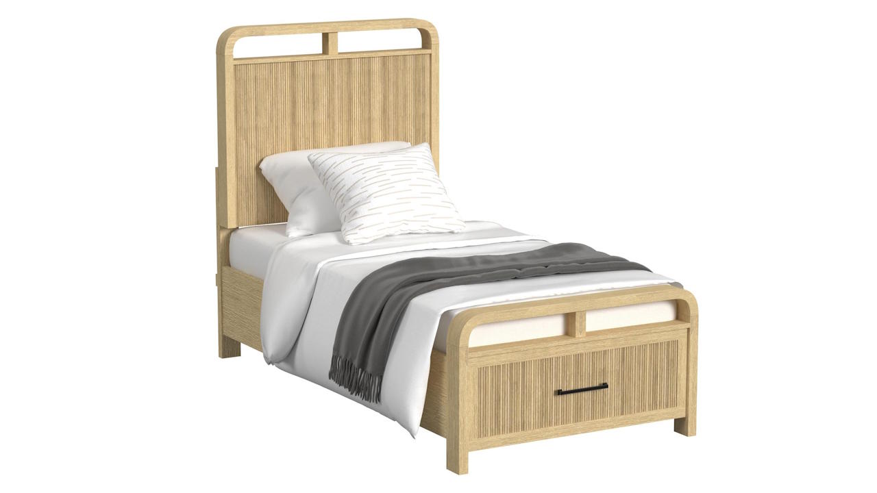The Ridgemont Twin Bed features a light wood finish with natural grain, sleek rounded edges, vertical reeding, and geometric cutouts for a modern, serene bedroom centerpiece.