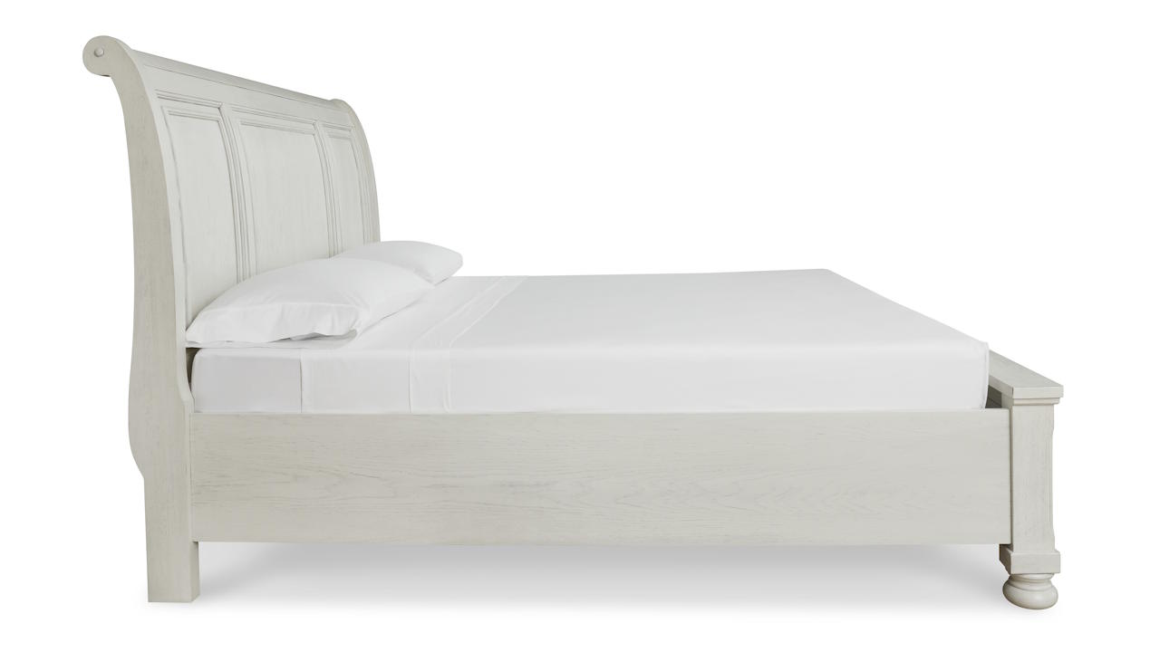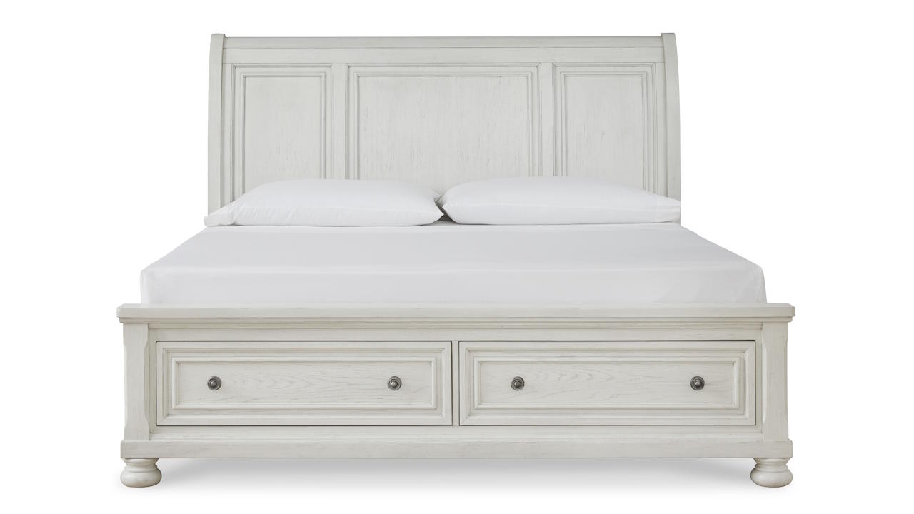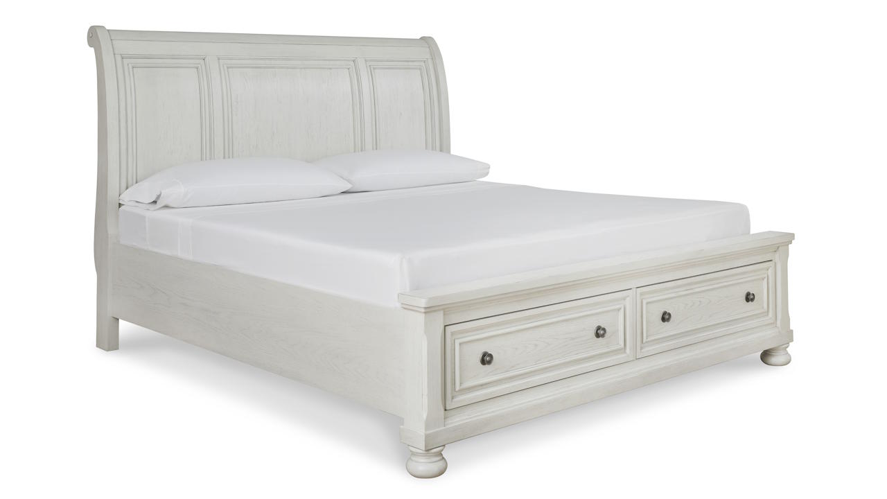 White Queen Size Storage Bedroom Set by Ashley. Includes Sleigh Storage Bed, Dresser with Mirror, and Nightstand. Antiqued Finish with Grain Texture. Adjustable Base Compatible.