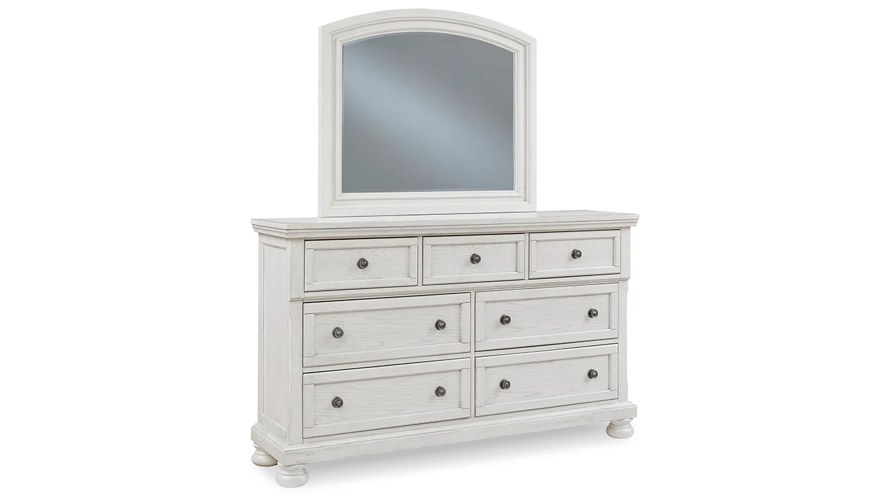 White Queen Size Panel Bedroom Set by Ashley. Includes Panel Bed, Dresser with Mirror, and Nightstand. Antiqued Finish with Grain Texture. Adjustable Base Compatible.