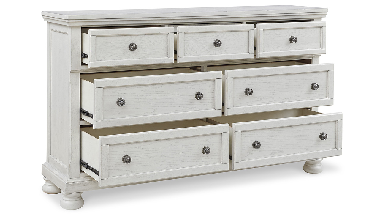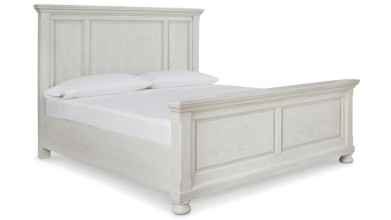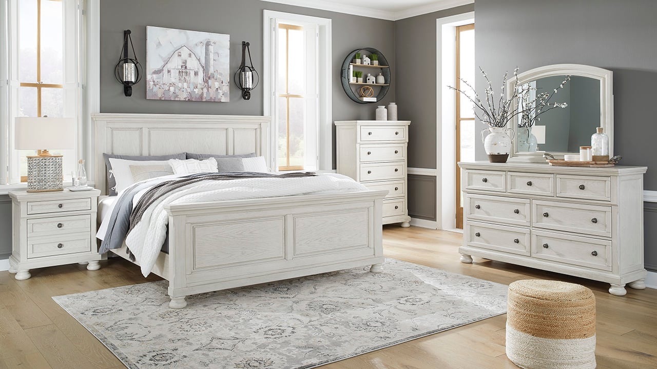 White Queen Size Panel Bedroom Set by Ashley. Includes Panel Bed, Dresser with Mirror, and Nightstand. Antiqued Finish with Grain Texture. Adjustable Base Compatible.