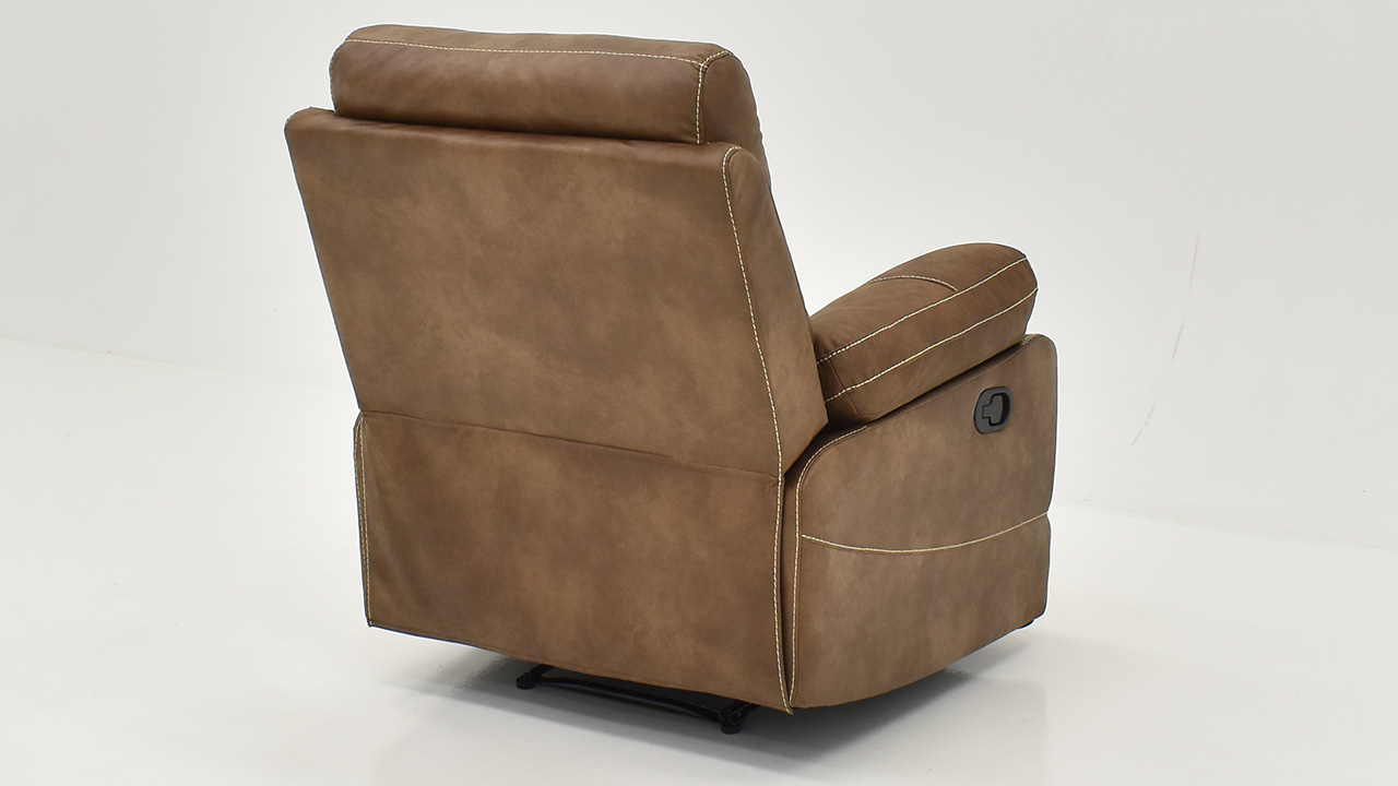 Wrapped in a chestnut brown microsuede cover, reminiscent of the rugged yet refined charm of an old bomber jacket, the Rudger recliner seamlessly combines style and comfort for an unrivaled home furnishing experience. Elevate your relaxation and style game with the Rudger manual reclining recliner from our Home Furniture Company.