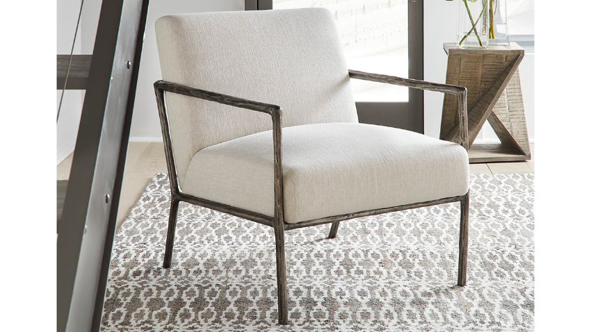 A modern take on a classic design, the Ryandale Accent Chair by Ashley provides both flair and function. Richly neutral upholstery gives off a vibe of easy elegance, bringing home high-end style for everyday living. An antiqued pewter-tone finish has a chic, distressed look that remains versatile, suiting spaces from casual to contemporary.