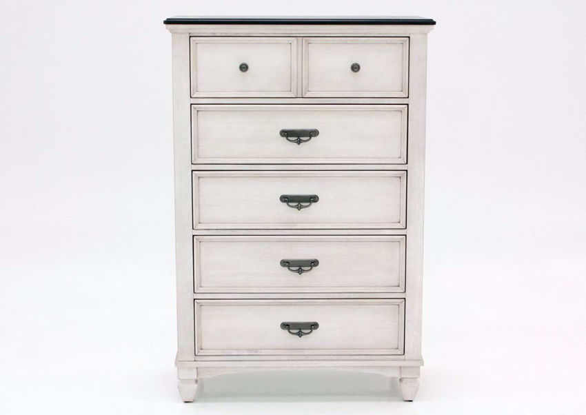 With hints of rustic, cottage and casual styles, the Sawyer Chest of Drawers by Crown Mark offers additional storage options to your bedroom retreat. This chest of drawers has a beautiful antique white finish with a rub through effect that allows slivers of browns and grays to peek through and is highlighted with a dark brown top. Decorative molding and framing details add a dressy touch to the casual design of the Sawyer Chest of Drawers. Additional features include classically designed antiqued drawer pulls and knobs.