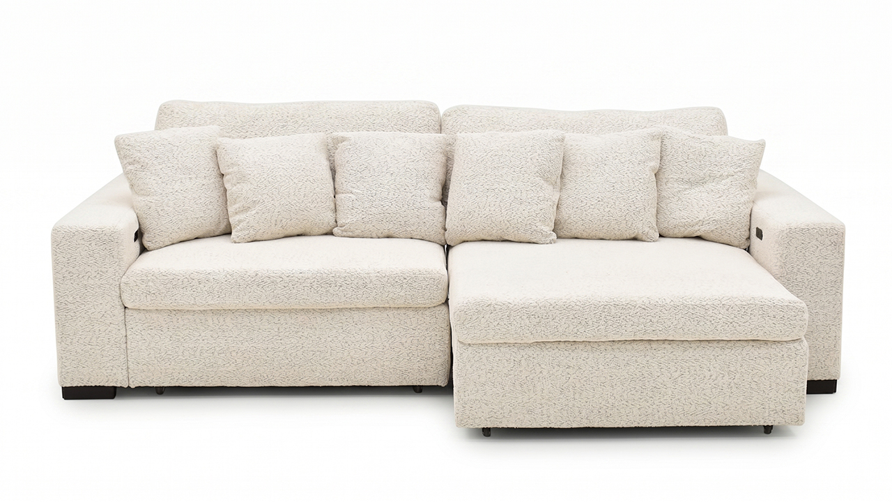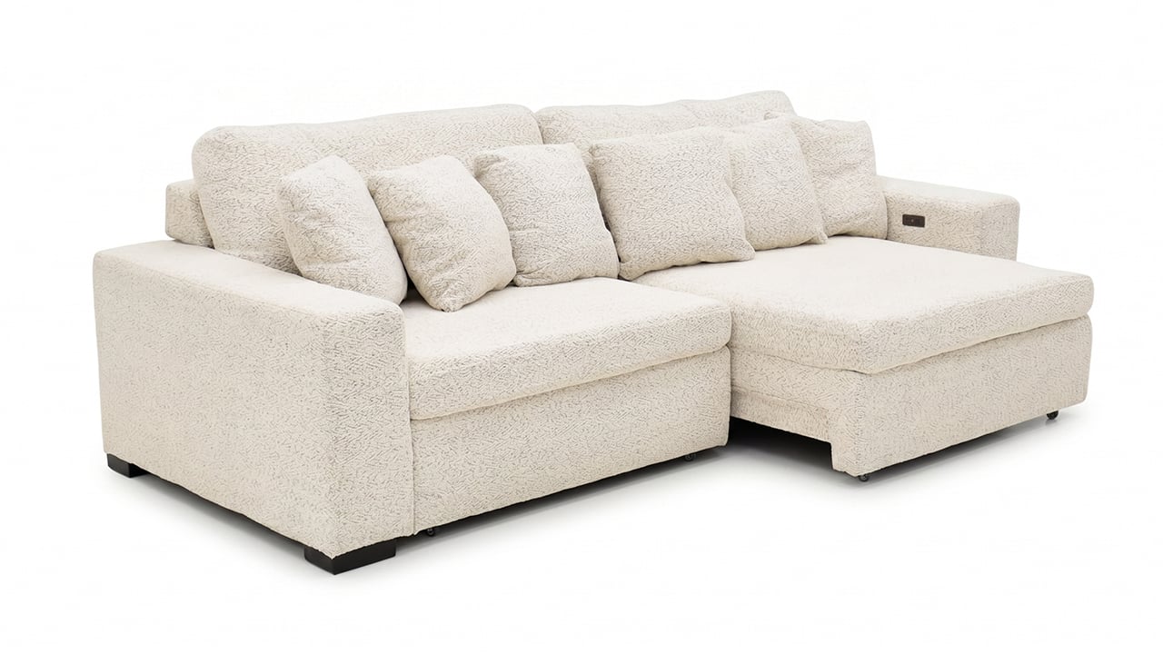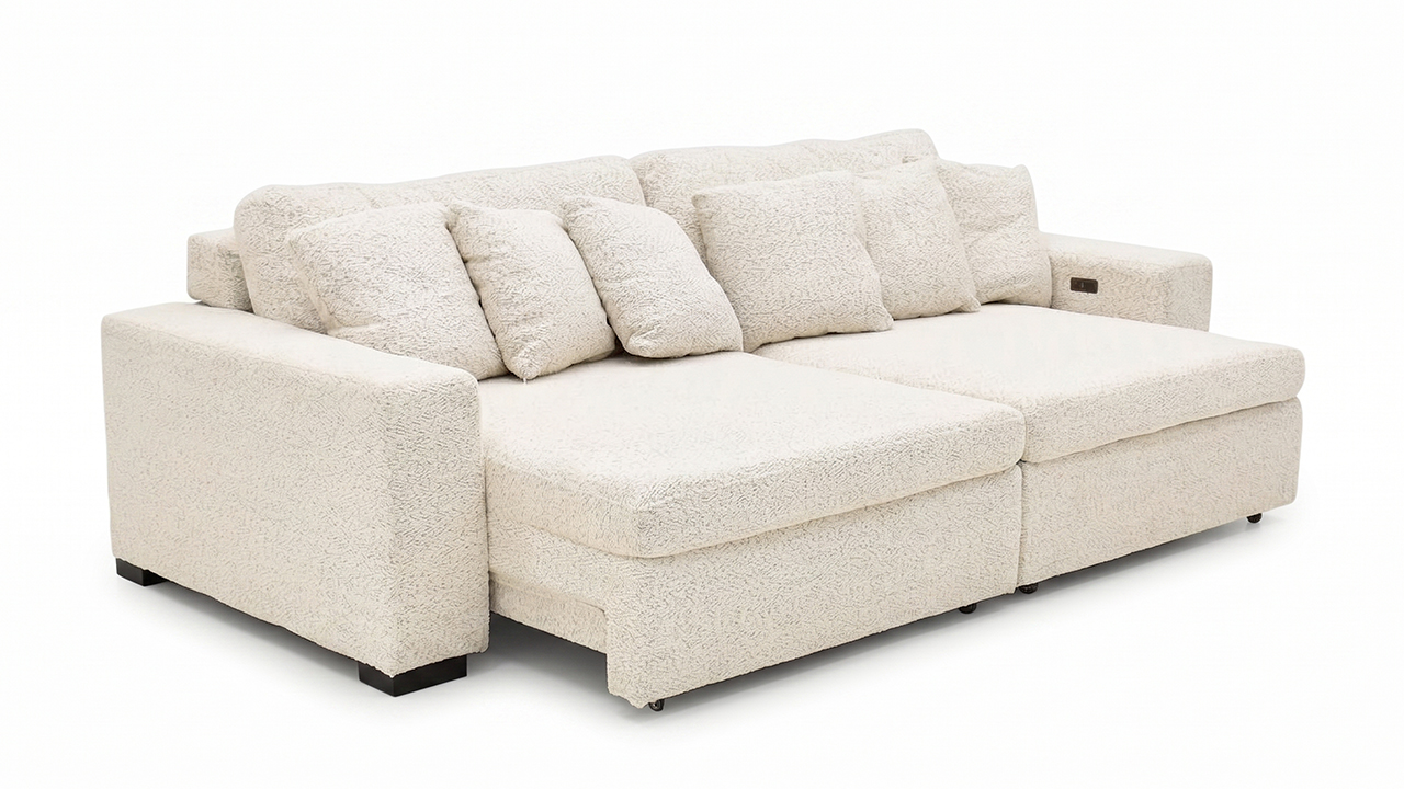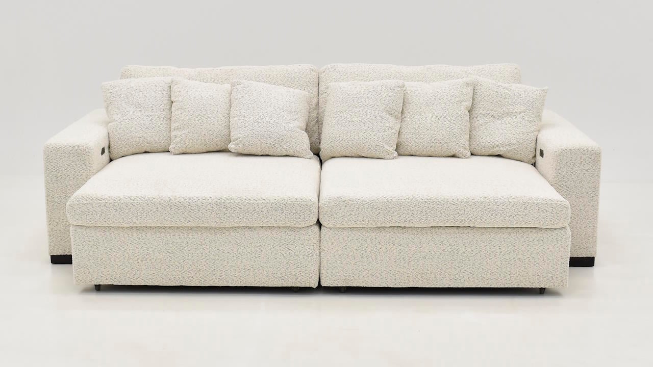 Clean and inviting, the Katy Power Slider Chair in white brings a fresh, modern feel to your space. Upholstered in a neutral, textured fabric in off-white or cream, it offers a soft, versatile look that brightens any room. Its minimalist design is complemented by an adjustable sliding chaise, providing flexibility and personalized comfort. Deep cushions and plush back pillows create a cozy retreat, while sleek black legs add a touch of contrast. Complete with a built-in USB charging port, this chair blends everyday convenience with effortlessly refined style.