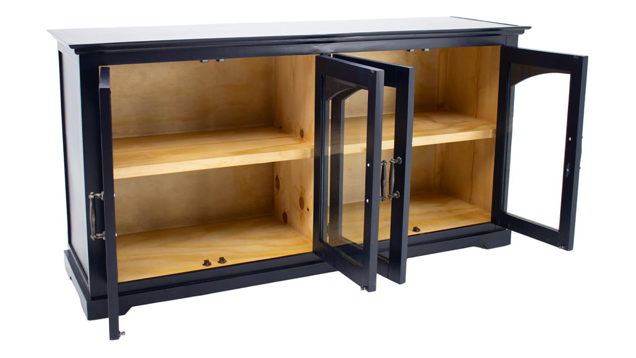 This elegant black console features four glass-front doors with arched accents, offering a blend of display and storage space. Its clean lines and sturdy build make it a versatile piece for any living room, dining area, or entryway.