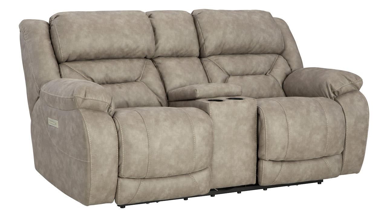 The Skywalker Power Loveseat in Fog features a power headrest, lumbar support, an extended footrest, and Zero Gravity technology for optimal comfort, plus a USB charging port for added convenience.