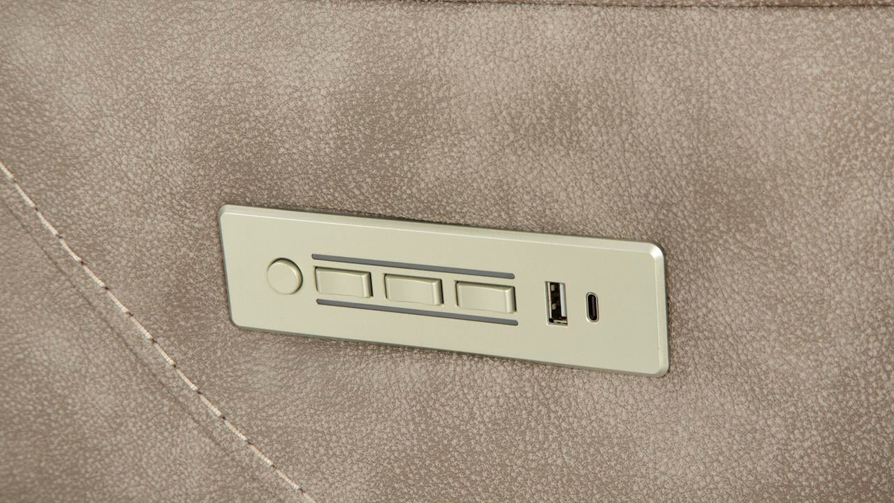 The Skywalker Power Sofa in Fog, features power headrest and lumbar support, an extended footrest, a Zero Gravity mechanism for enhanced comfort, and a USB charging port for ultimate relaxation and convenience.