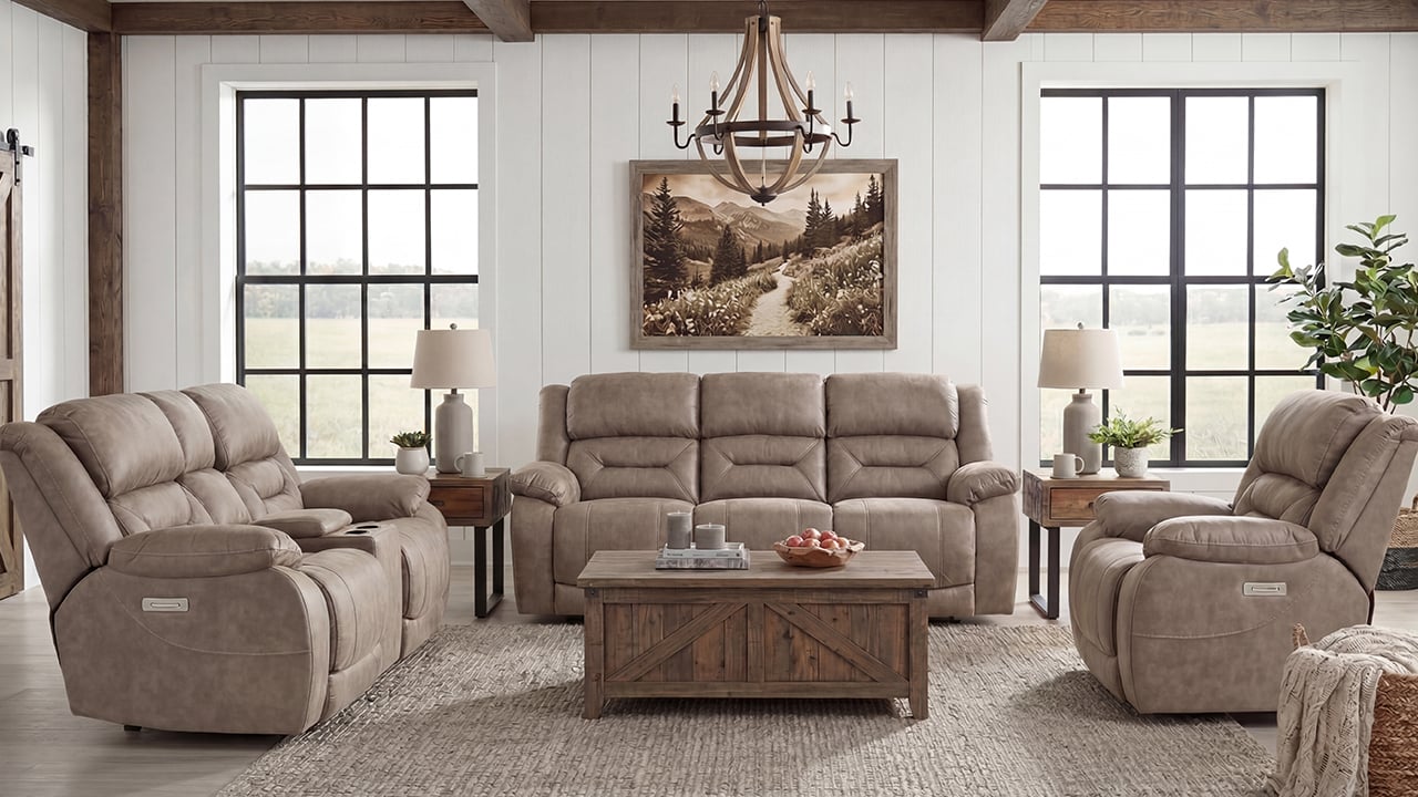 The Skywalker Power Reclining Sofa Set in Brown, which includes a sofa, loveseat, and recliner, offers ultimate comfort with features like power headrests, lumbar support, extended footrests, a Zero Gravity mechanism for pain relief and better circulation, and built-in USB ports for charging devices.