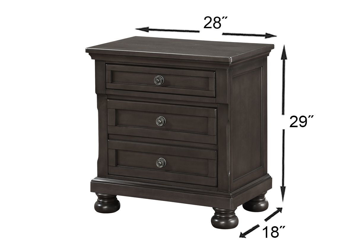 The Sophia Bedroom Collection by Avalon Furniture has a lightly distressed trendly gray. This traditional Louis Philippe inspired group is constructed of pine solids and veneers. Sleigh bed with two convenient storage drawers. Antique bronze finished hardware displayed throughout the collection. Clean lines, framed drawer fronts, and felt lined top drawers. The dresser and nightstand have hidden drawers, and convenient double USB ports.