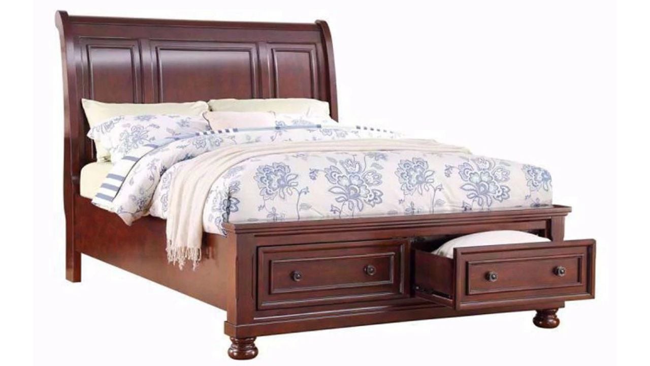 Sophia King Size Sleigh Bed by Avalon Furniture. Cherry Brown Finish. Traditional Louis Philippe Style. Storage Drawers.