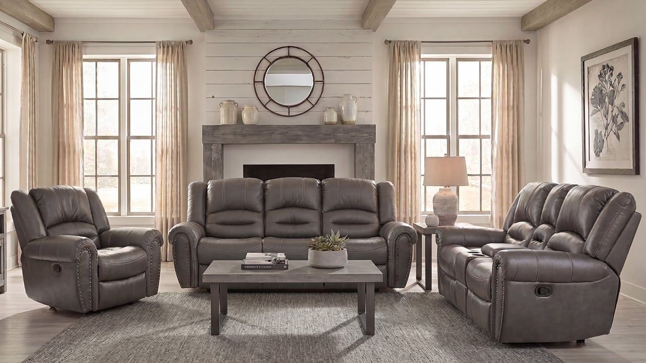 Includes reclining sofa, reclining loveseat, and glider recliner