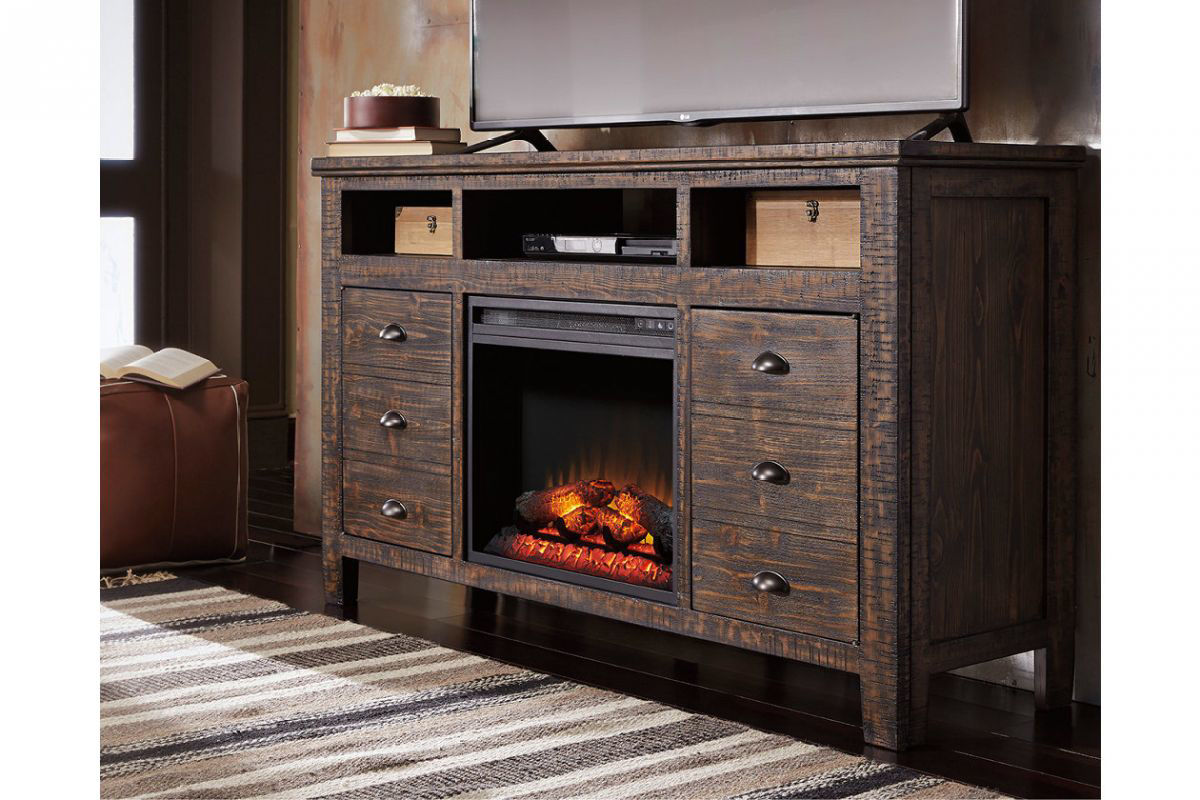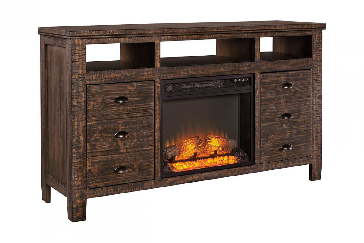 You will love the vintage style of the trendy Trudell TV Stand with Fireplace from Signature Design by Ashley. Attention to detail of this solid pine piece can be noticed with its beautiful weathered dark brown finish and beautiful electric fireplace insert. This is not your traditional TV Stand or traditional fireplace - it's the best of both! Features include a subtle wire brushing with varying natural distressed accents. Notice the faux drawers that are actually dual doors with bin pulls. The doors are infused with a charming and inviting look that will also maximize your storage potential with adjustable shelves inside. Quality Built to Last.