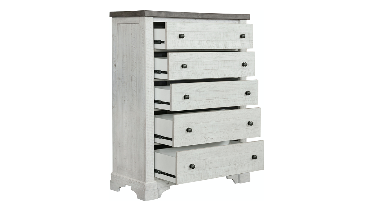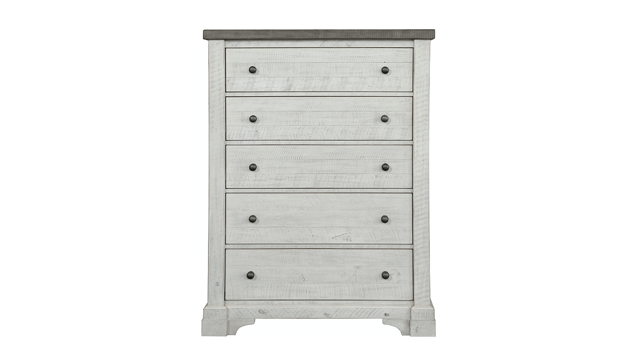 Bring farmhouse charm and practical elegance to your bedroom with this dresser and mirror set. Distressed white and gray finishes, dovetail drawer construction, and subtle bronze hardware combine for a timeless, functional piece.