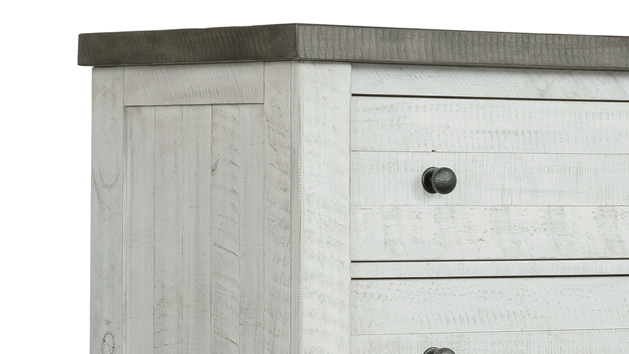 Blend style and convenience with this transitional farmhouse nightstand. Distressed white and gray finishes, two spacious drawers, and built-in USB ports make it a functional and charming addition to any bedroom.