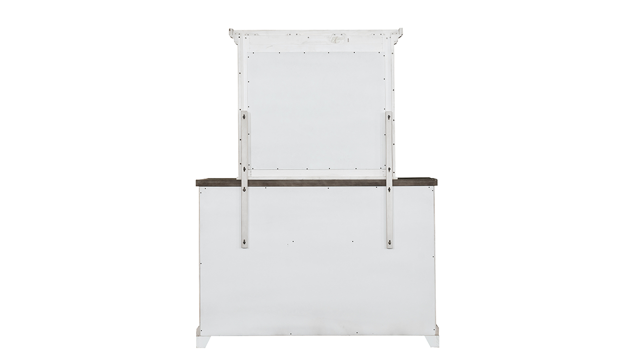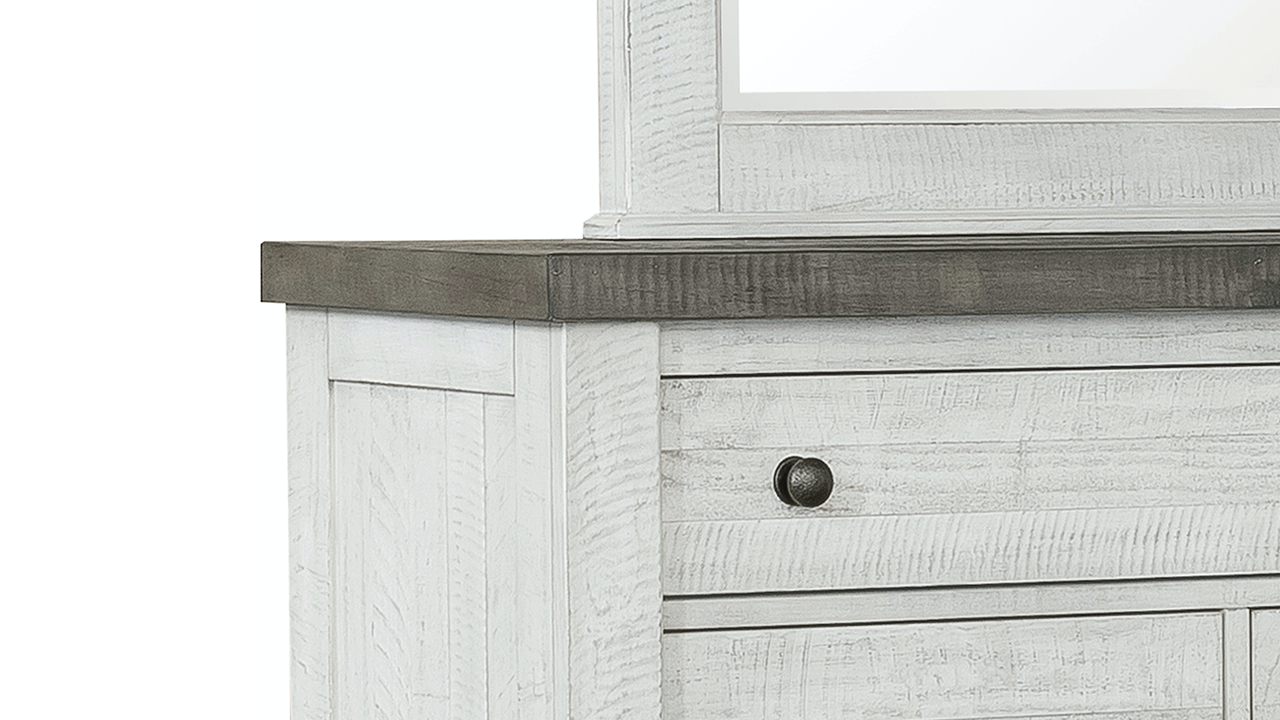Add farmhouse charm and practical storage with this 5-drawer chest. A distressed white and gray finish, classic panel styling, and elegant bronze hardware create a timeless piece designed to complement any bedroom.