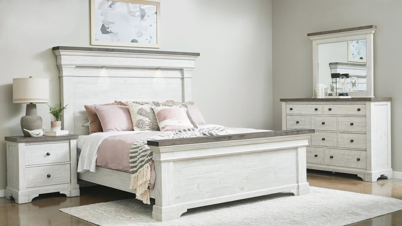 Bring timeless farmhouse charm and modern convenience to your bedroom with this king size bedroom set. Distressed white and gray finishes, built-in headboard lighting, USB-equipped nightstand, and bronze hardware make every piece both stylish and functional.