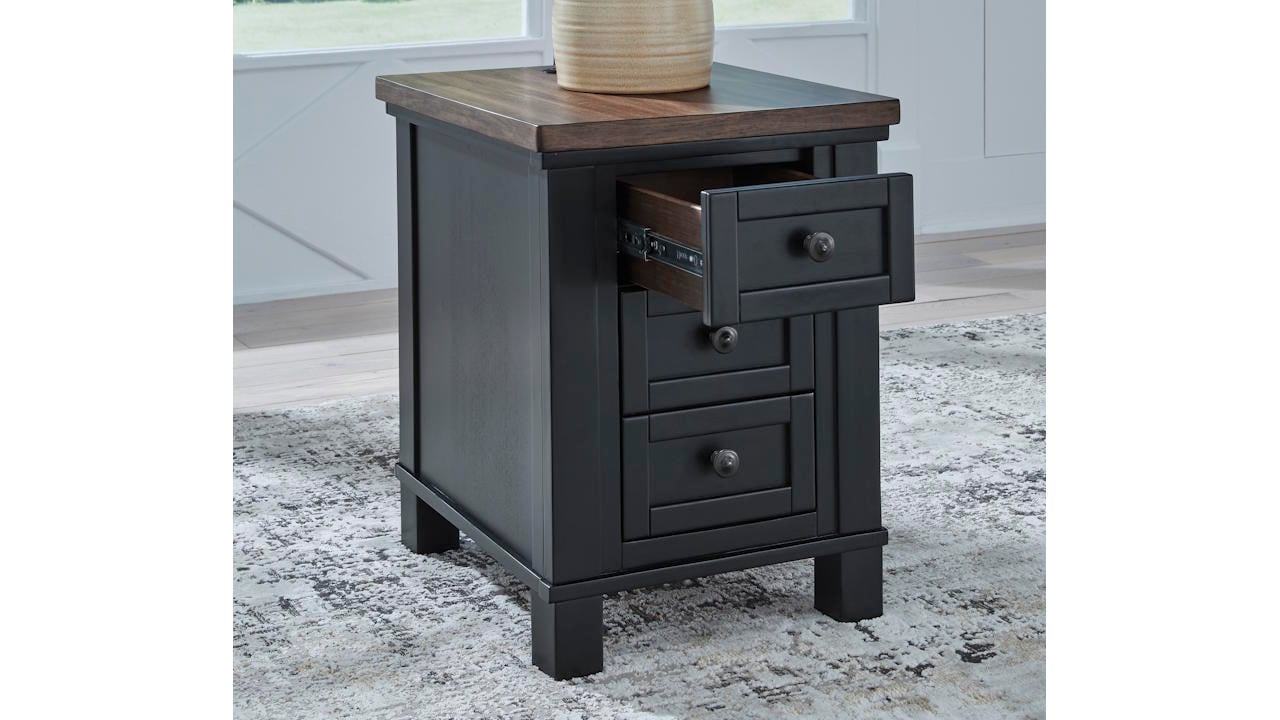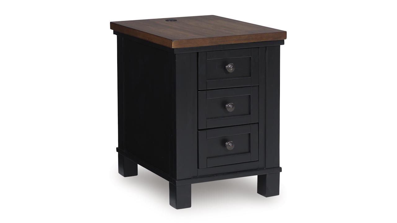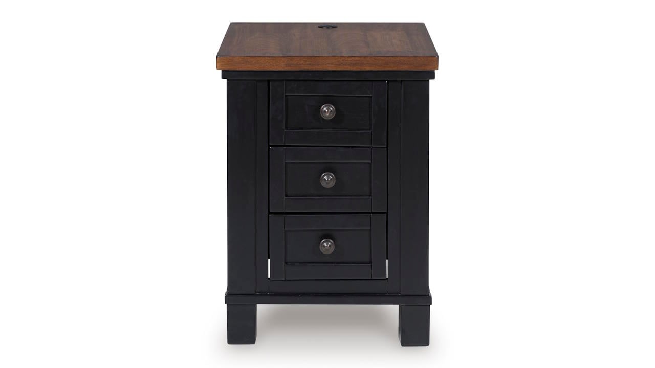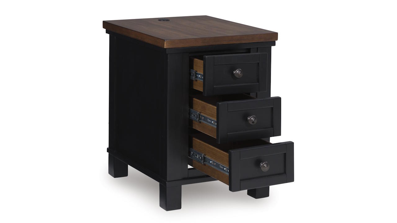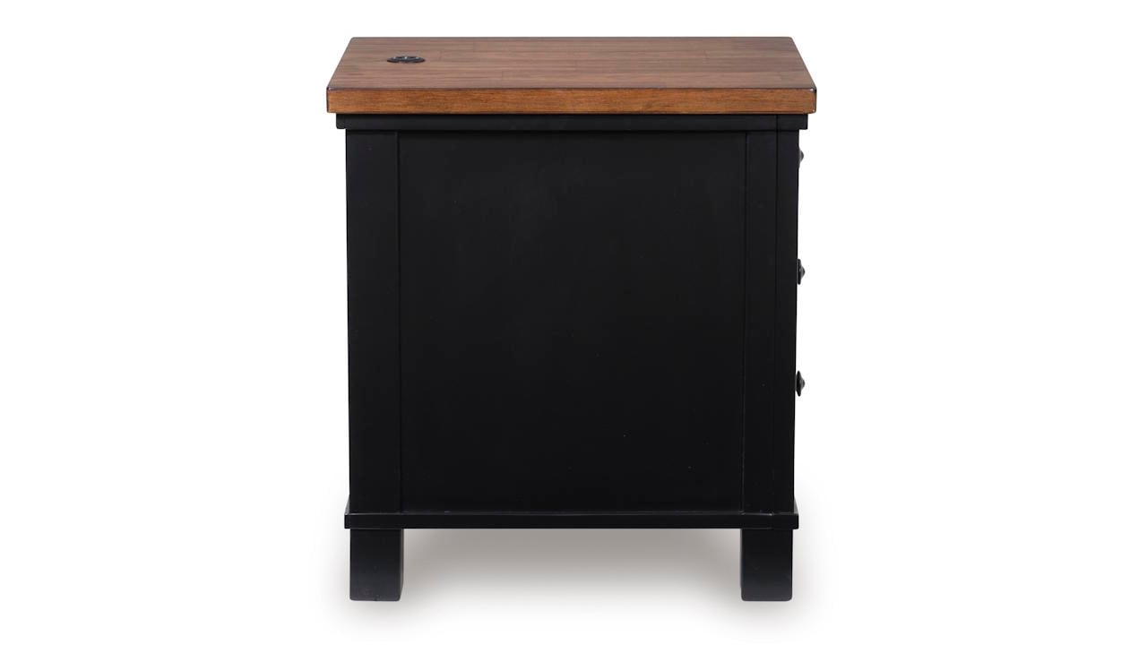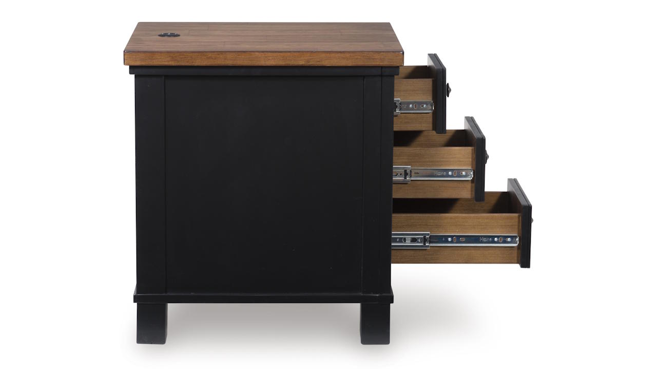 The Wildenauer Chairside End Table in Black with Brown Top offers a refined take on modern farmhouse style. Featuring a strong silhouette with a blend of casual elegance, this table is built to impress with its two-tone finish. The warm satin black base complements the rich brown butcher block veneer top, creating a striking contrast that elevates any space. Practicality meets style with three smooth-gliding drawers, offering generous storage, and dual USB charging ports to keep devices powered and easily accessible. Crafted from durable hardwood solids, mango wood veneer, and MDF substrates, this table ensures both quality and longevity. The hardware is finished in dark pewter-tone, adding a touch of sophistication. Perfect for vintage, country, or eclectic interiors, the Wildenauer Chairside End Table is a functional and stylish addition to your home.