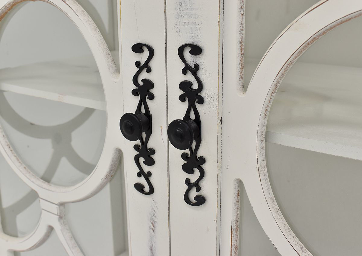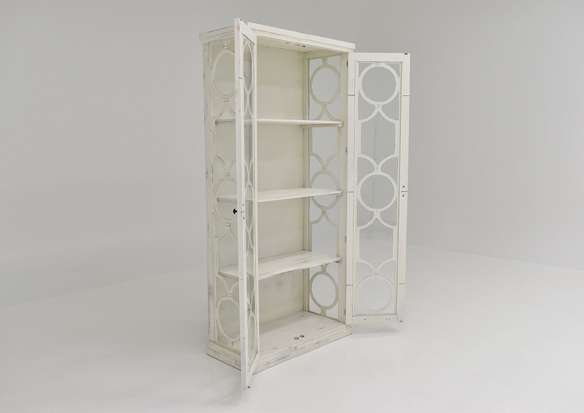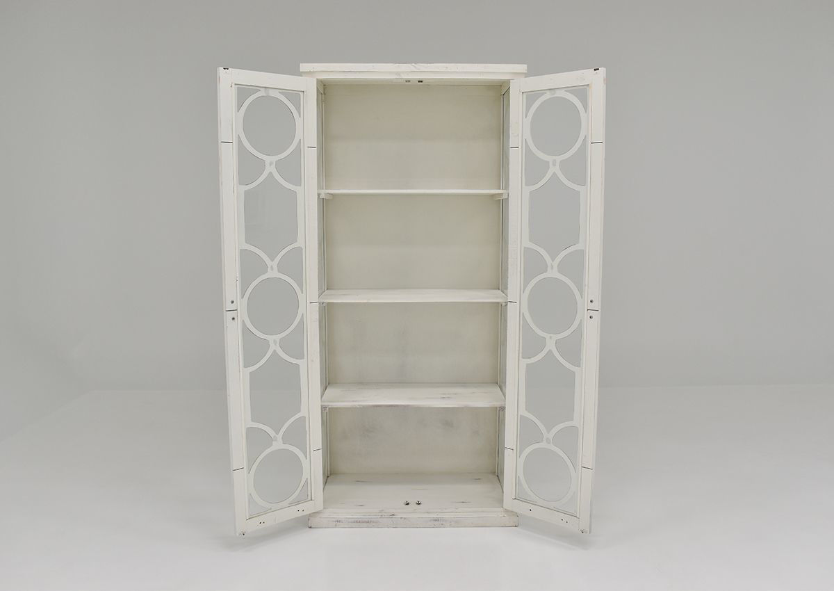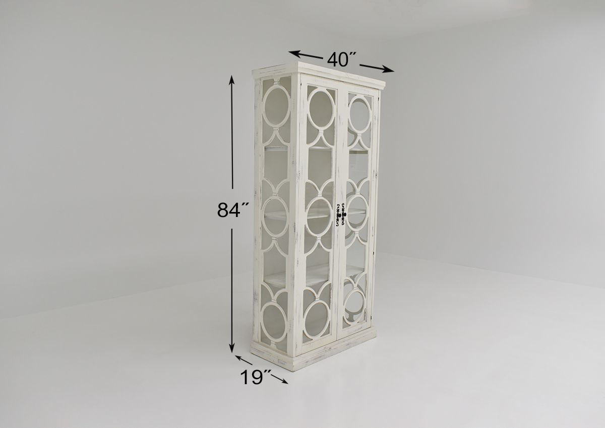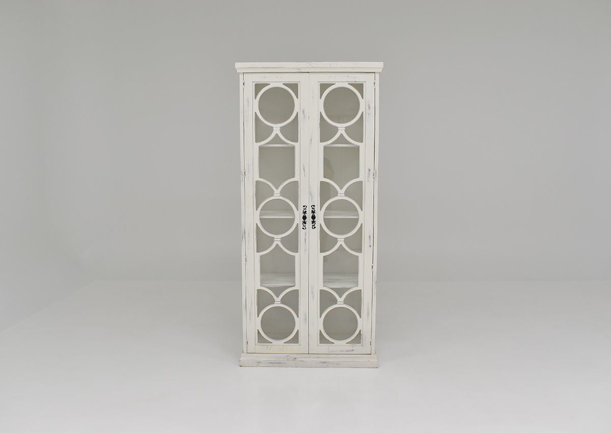 A tall and stately guardian to display your favorite treasures, the Windamere Accent Cabinet in White is a grand addition to the living room, dining room, or hall. Three interior shelves wait behind the glass-paned doors to store your items. Each piece is hand-stained and unique - no piece is exactly like another due to the human touch. Scrolled metal hardware on the door adds a finishing touch to the circle motif featured prominently on this vitrine.