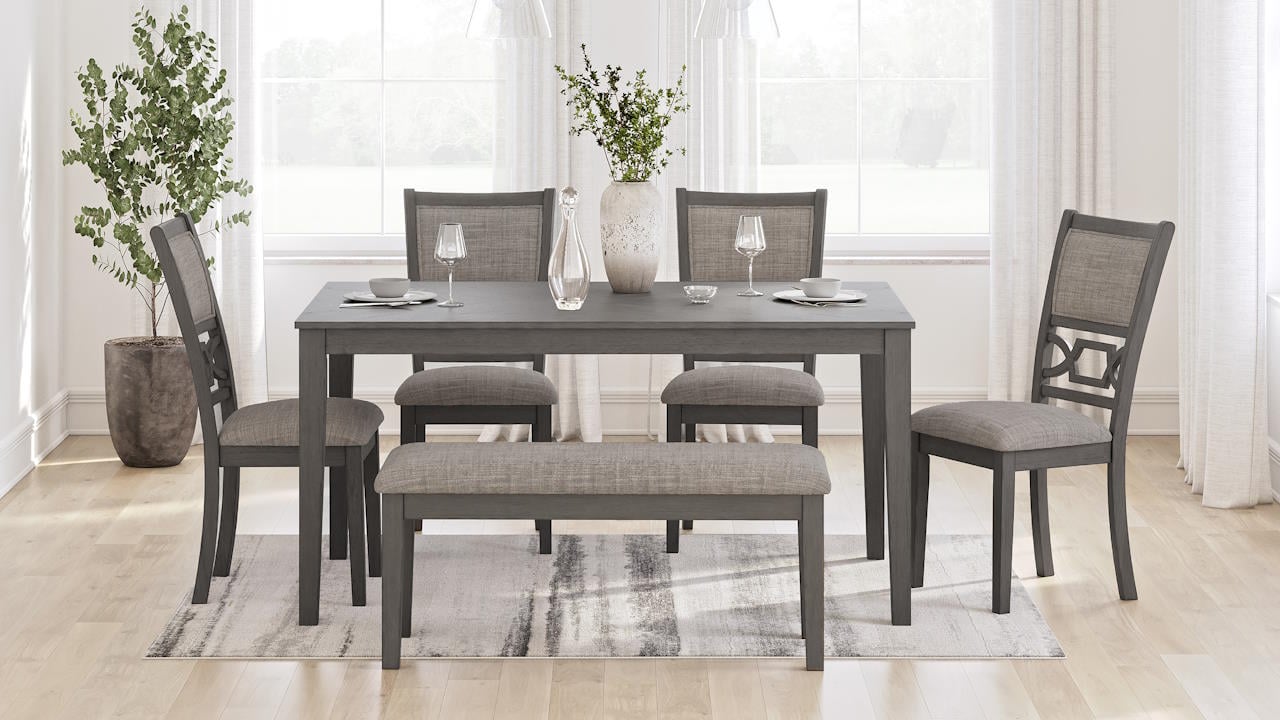 Elevate your dining space with the Ashlee 6-Piece Dining Set, a perfect blend of classic charm and modern sophistication. Designed in a versatile transitional style, this ensemble combines clean lines with subtle details for a timeless yet contemporary feel. Ideal for family meals or entertaining guests, the set includes a spacious dining table, four upholstered chairs, and a matching bench—comfortably seating up to six.