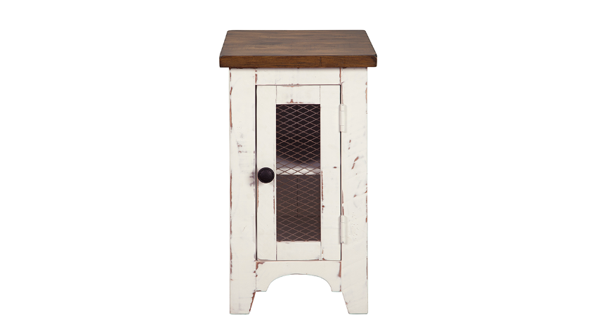 Double take. Sporting a two-tone finish that pairs a distressed vintage white with aged natural pine color, this chairside end table elevates the art of rustic farmhouse living. Enhancing its charm: shelved storage visible through the cabinet door with inset metal grill. The Wystfield Chairside End Table by Ashley Furniture is great for home or office.